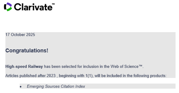 Recently, High-speed Railway (HSPR), an English-language journal sponsored by Beijing Jiaotong University, has been officially indexed in two prestigious national and international databases: the Emerging Sources Citation Index (ESCI) and the Chinese Science Citation Database (CSCD).
